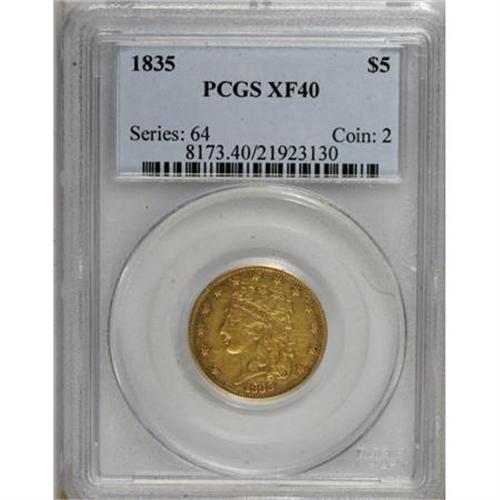 <B>1835 $5 XF40 PCGS.</B></I> First Head, Breen-6504, McCloskey 1-A, R.2. The 5 in the denomination is almost completely below the feathers in the fletchings. Well struck with light to moderate wear over each side and light, scattered abrasions on the dusky antique-gold surfaces.<BR><BR><B>Coin Engraver:</B> William Kneass<BR><BR><b>Shipping:</b> Coins & Currency (<a target="_blank" href="http://www.heritageauctions.com/common/shipping.php">view shipping information</a>)
