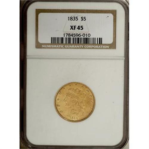 <B>1835 $5 XF45 NGC.</B></I> First Head, Breen-6504, McCloskey 1-A, R.2. The leftmost pairs of olive leaves bracket the U of UNITED, and the 5 in the denomination is shifted to the right compared to other reverses. Rich rose-gold is noted as is a surprising amount of luster visible in the protected areas, which also demonstrate a pleasing reflectivity.<BR><BR><B>Coin Engraver:</B> William Kneass<BR><BR><b>Shipping:</b> Coins & Currency (<a target="_blank" href="http://www.heritageauctions.com/common/shipping.php">view shipping information</a>)