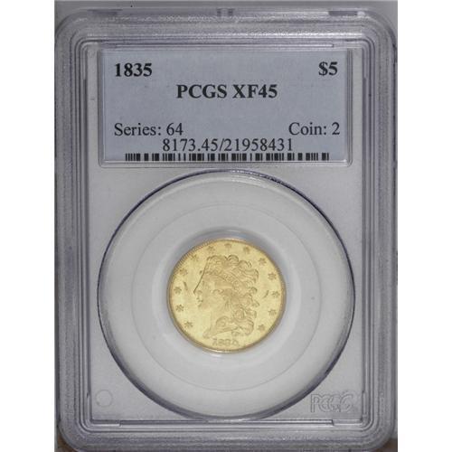 <B>1835 $5 XF45 PCGS.</B></I> Breen-6504, First Head, McCloskey 1-A, R.2. A sharply struck Classic half eagle with subtle glimmers of remaining luster on the devices and legends. Moderate obverse marks are noted near stars 3 and 11.