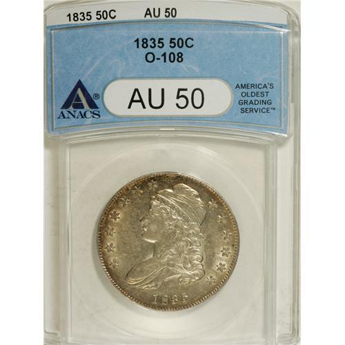 <B>1835 50C AU50 ANACS.</B></I> O-108. NGC Census: (36/432). PCGS Population (51/332). Mintage: 5,352,006. Numismedia Wsl. Price for NGC/PCGS coin in AU50: $225. (#6168)<BR><BR><b>Shipping:</b> Coins & Currency (<a target="_blank" href="http://www.heritageauctions.com/common/shipping.php">view shipping information</a>)