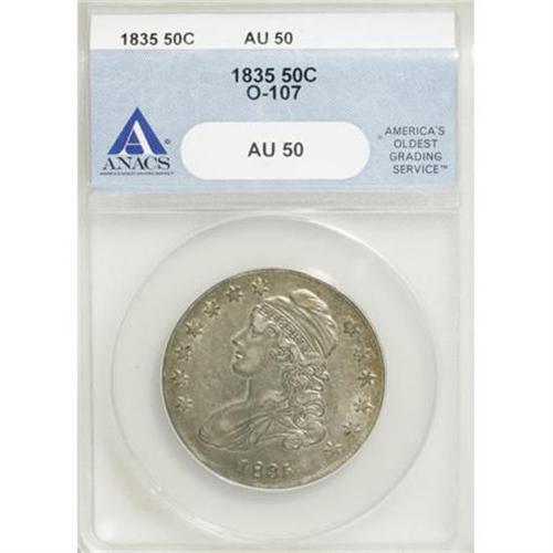 <B>1835 50C AU50 ANACS.</B></I> O-107. NGC Census: (36/439). PCGS Population (53/345). Mintage: 5,352,006. Numismedia Wsl. Price for NGC/PCGS coin in AU50: $225. (#6168)<BR><BR><B>Coin Engraver:</B> John Reich<BR><BR><b>Shipping:</b> Coins & Currency (<a target="_blank" href="http://www.heritageauctions.com/common/shipping.php">view shipping information</a>)