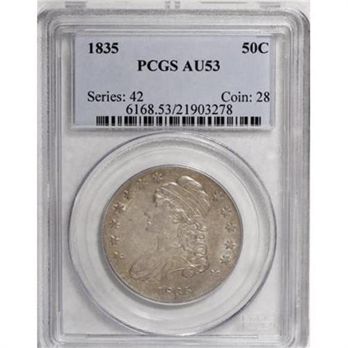 <B>1835 50C AU53 PCGS.</B></I> PCGS Population (40/306). NGC Census: (39/407). Mintage: 5,352,006. Numismedia Wsl. Price for NGC/PCGS coin in AU53: $242. (#6168)<BR><BR><B>Coin Engraver:</B> John Reich<BR><BR><b>Shipping:</b> Coins & Currency (<a target="_blank" href="http://www.heritageauctions.com/common/shipping.php">view shipping information</a>)