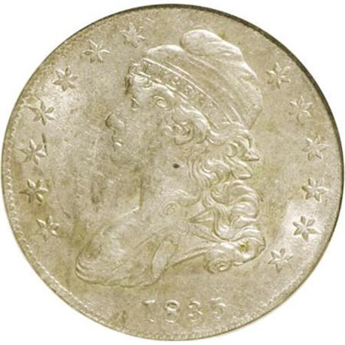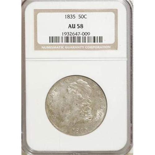 <B>1835 50C AU58 NGC.</B></I> NGC Census: (148/184). PCGS Population (86/133). Mintage: 5,352,006. Numismedia Wsl. Price for NGC/PCGS coin in AU58: $575. (#6168)<BR><BR><B>Coin Engraver:</B> John Reich<BR><BR><b>Shipping:</b> Coins & Currency (<a target="_blank" href="http://www.heritageauctions.com/common/shipping.php">view shipping information</a>)