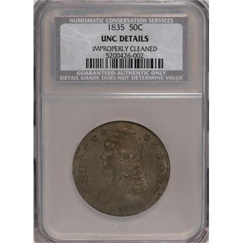 <B>1835 50C --Improperly Cleaned--NCS. Unc Details.</B></I> NGC Census: (6/178). PCGS Population (8/127). Mintage: 5,352,006. Numismedia Wsl. Price for NGC/PCGS coin in MS60: $900. (#6168)<BR><BR><B>Coin Engraver:</B> John Reich<BR><BR><b>Shipping:</b> Coins & Currency (<a target="_blank" href="http://www.heritageauctions.com/common/shipping.php">view shipping information</a>)