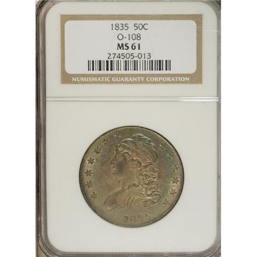 <B>1835 50C MS61 NGC.</B></I> O-108, R.3. Luminous sea-green and apricot-gold embrace this sharply struck example. A cluster of small marks near the forehead precludes a higher numerical designation.<BR><BR><b>Shipping:</b> Coins & Currency (<a target="_blank" href="http://www.heritageauctions.com/common/shipping.php">view shipping information</a>)
