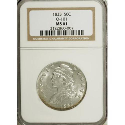 <B>1835 50C MS61 NGC.</B></I> O-101, R.1. O-101 and O-102 share a common reverse and have similar obverses, but O-101 has a curved-top 5 and O-102 has a flat-top 5. Brilliant aside from a slender arc of golden-brown along the obverse margin. Sharply struck, smooth, and satiny.<BR><BR><B>Coin Engraver:</B> John Reich<BR><BR><b>Shipping:</b> Coins & Currency (<a target="_blank" href="http://www.heritageauctions.com/common/shipping.php">view shipping information</a>)