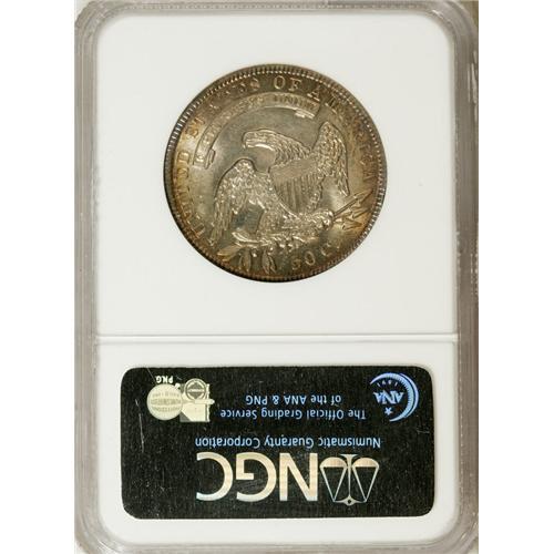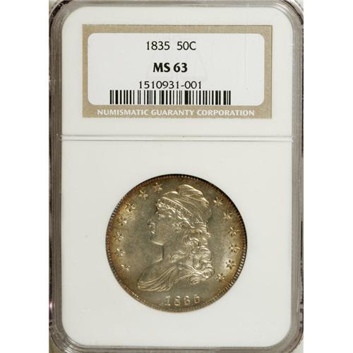 <B>1835 50C MS63 NGC.</B></I> O-103, R.2. Die defect lines in the shield identify the reverse and thus the variety. Golden-brown toning at the periphery, accented with blue-violet on the reverse, fades to champagne in the center. Lustrous and attractive with a sharp strike apart from the plumage near the left shield border.<BR><BR><b>Shipping:</b> Coins & Currency (<a target="_blank" href="http://www.heritageauctions.com/common/shipping.php">view shipping information</a>)