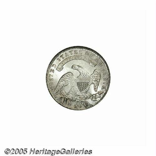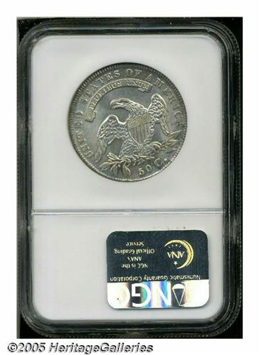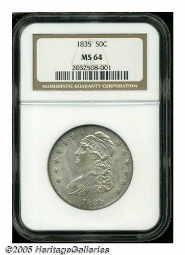 <B>1835<50C> MS64 NGC.</B></I> O-106, R.1. Light tan and pearl-gray colors grace this lustrous and well struck near-Gem. Only a couple of stars have not received an exacting blow for the dies. Liberty's nose, cheek, forehead, and bust drapery does not have the flatness sometimes encountered on Mint State examples of the type. A few unimportant grazes in the field near the twelfth star, but the surfaces are quite clean overall, and specialists will be hard pressed to locate a finer example of the date.
