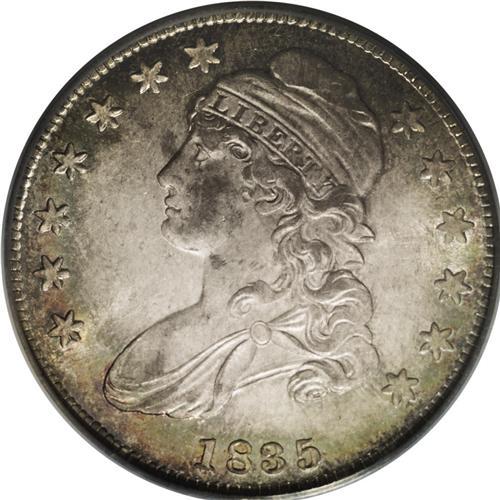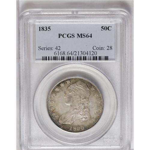 <B>1835<50C> MS64 PCGS.</B></I> O-102, R.3. An original Choice example, with sea-green peripheral toning accenting the silver-gray centers. The strike is a little on the soft side, with no star centrils visible and some weakness in the motto and left (facing) wing. Pleasing soft satin luster encircles both sides of the coin. Population: 27 in 64, 2 finer (8/06).