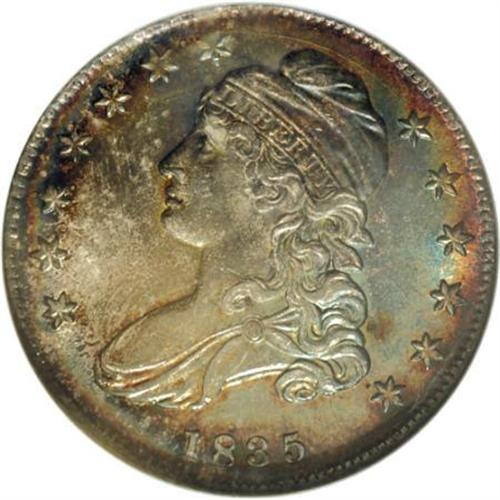 <B>1835 50C MS66 NGC.</B></I> O-108, R.3. The lustrous, original surfaces are layered in speckled silvery-gray patina, with deeper arcs of russet and sea-green iridescence about the peripheries. Crisply struck, and well preserved despite a hair-thin mark near the left scroll end. Most likely the finest known example of the die pairing, and high on the list for any 1835 Half Dollar. NGC O-108 Population: 1 in 66, none finer (6/07).<BR><BR><B>Coin Engraver:</B> John Reich<BR><BR><b>Shipping:</b> Coins & Currency (<a target="_blank" href="http://www.heritageauctions.com/common/shipping.php">view shipping information</a>\)