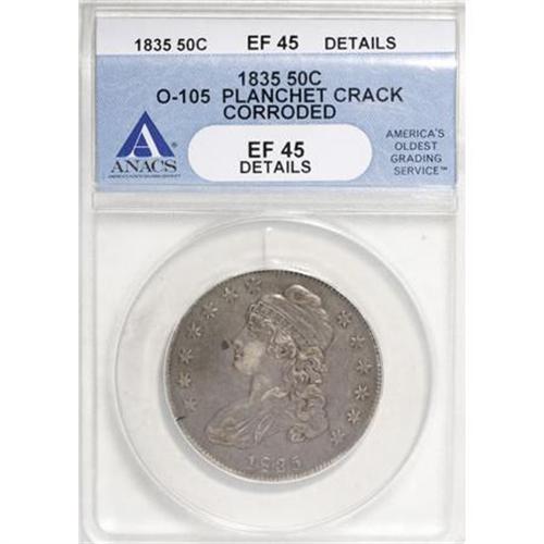 <B>1835 50C Half Dollar--Planchet Crack, Corroded--ANACS. XF45 Details.</B></I> O-105. NGC Census: (59/483). PCGS Population (51/401). Mintage: 5,352,006. Numismedia Wsl. Price for NGC/PCGS coin in XF45: $131. (#6168)<BR><BR><B>Coin Engraver:</B> John Reich<BR><BR><b>Shipping:</b> Coins & Currency (<a target="_blank" href="http://www.heritageauctions.com/common/shipping.php">view shipping information</a>)