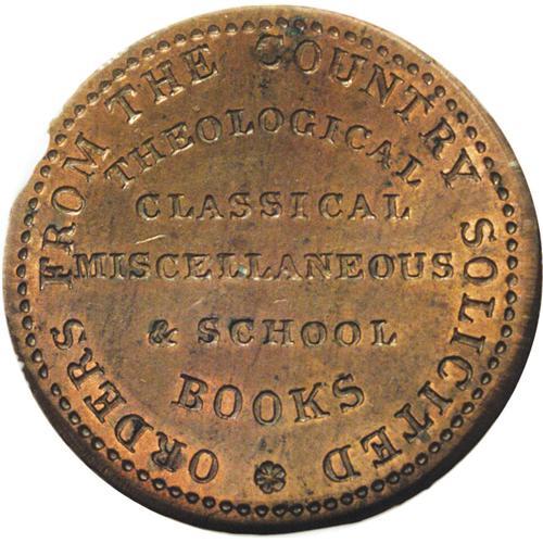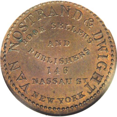 <B>(1835-7) Van Nostrand & Dwight, Low-287, HT-336, R.2, New York City, NY, MS63 Brown NGC.</B></I> Copper. Original orange-red luster emerges from portions of the borders, while the fields are toned medium brown. A couple of minor spots are of little concern. Struck with medal turn. These book publishers were at 146 Nassau St. in 1836-7. Dies engraved by Bale & Smith.<BR><I>From The Troy Wiseman Collection.</B></I>