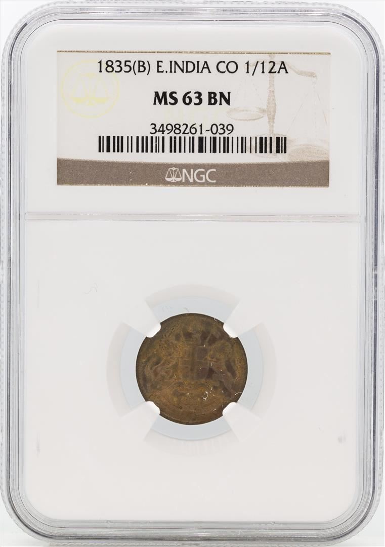 One 1835(B) East India Co. 1/12 Anna Coin NGC MS63BN. NGC Certified.