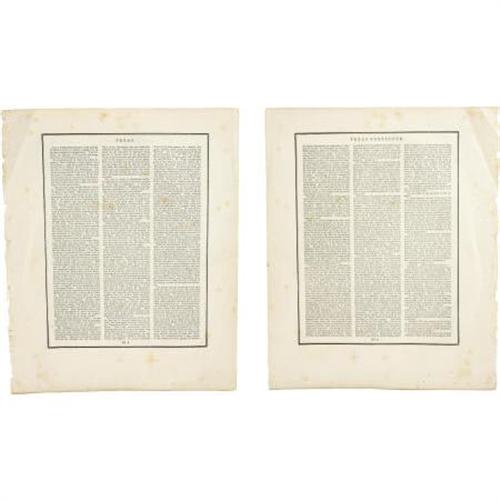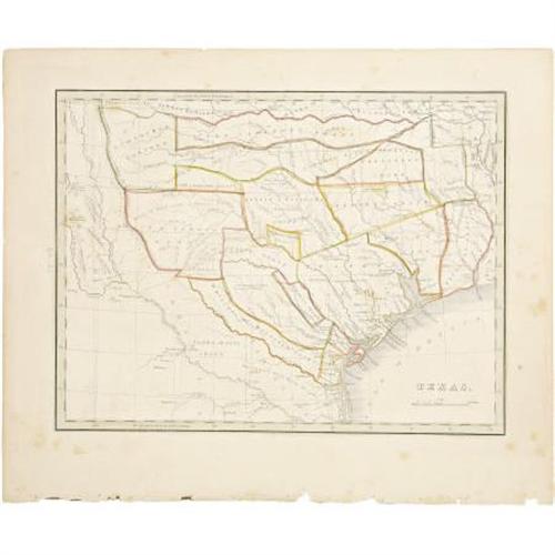 <B>1835 Bradford's Map of Texas</B></I> , 12.75" x 10.25". With accompanying text of similar size headed "<I>Texas</B></I>," two pages, front and verso, beginning "<I>It is a northeastern province of the republic of Mexico, and is at present engaged in an arduous struggle for independence.</B></I>" Light folds in upper bank corner. This map (identified as "<I>64.A.</B></I>") and two page text ("<I>64B</B></I>" and "<I>64C</B></I>") have been removed from T.G. Bradford's atlas, Boston and New York, 1835. <B>This is the first separate map of Texas ever to appear in an atlas.</B></I> All grants are identified, e.g. "<I>Stephen F. Austins Grant</B></I>," "<I>Burnets Grant</B></I>," "<I>Dewitts Grant</B></I>," "<I>Zavalias Grant</B></I>," etc., as are areas labeled "<I>Comanches Indians</B></I>" and "<I>Austins Colony</B></I>." All grants and areas are outlined in color. Both sheets are lightly foxed; chipped edge where removed from atlas. Very good condition.<BR><BR><b>Shipping:</b> Flat Material, Large (<a target="_blank" href="http://www.heritageauctions.com/common/shipping.php">view shipping information</a>)<BR><BR><B>Important notice:</