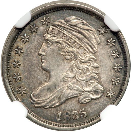 1835 Capped Bust Dime. NGC graded AU-58. Nice old time toning.
