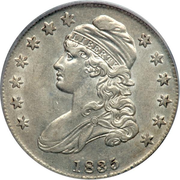 1835 Capped Bust Half Dollar. PCGS graded AU-55. A hint of light tone on this still-lustrous example (PCGS # 6168) .