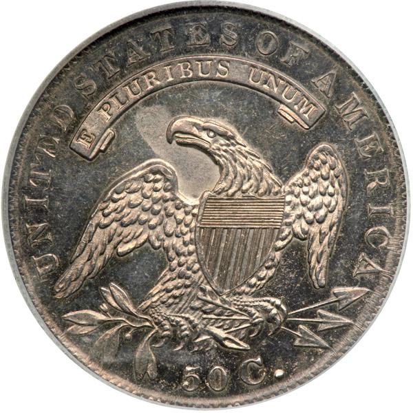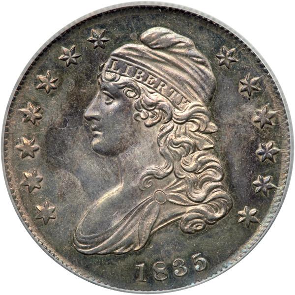1835 Capped Bust Half Dollar. ICG graded MS-65. Mottled iridescent toning over semi reflective surfaces on both sides. A solid gem in all regards. The satiny surfaces are alight with sizzling luster, the strike is clear-cut, and the eye appeal is nothing short of exceptional. On this variety, the date is in a straight line while stars 7, 11 and 13 are recut. On the reverse, the small 5 is nearly closed and the C is much larger than 50.