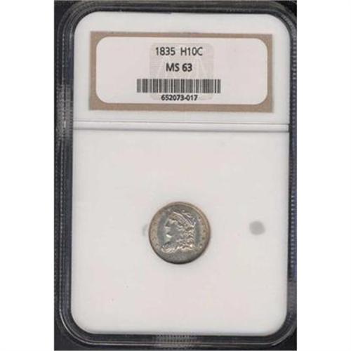 <b>1835 Capped Bust Half Dime. Large date, large 5¢. NGC graded MS63.</b> Choice mint luster on satiny light champagne gold peripheries. A touch of weakness is seen at the center on the reverse, but here it is probably that the dies were spaced just far enough apart to prevent strong metal flow in the shield and wing overlap; the obverse details are nice and crisp on the hair curls and cap <b>(PCGS # 4282)</b>