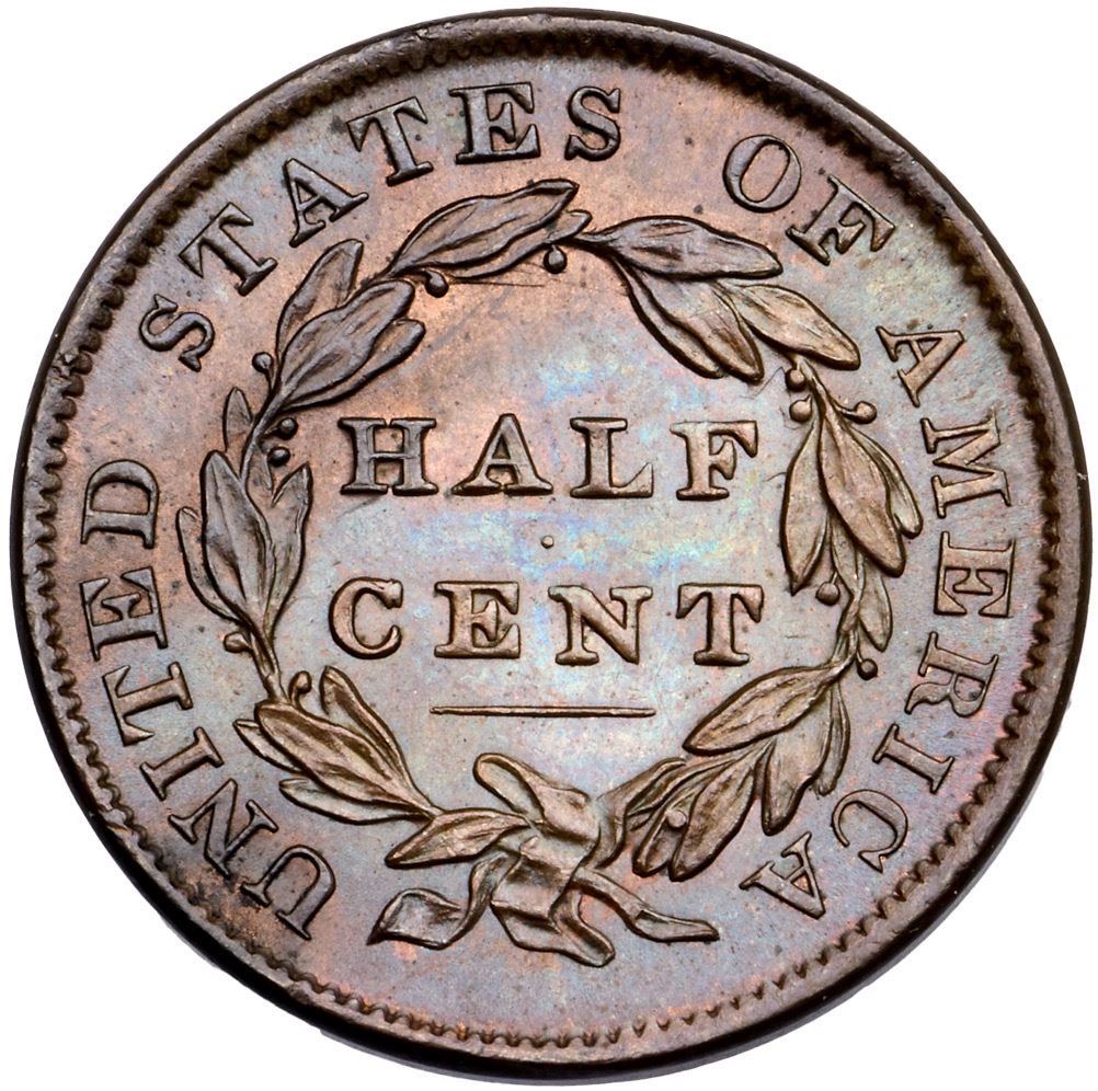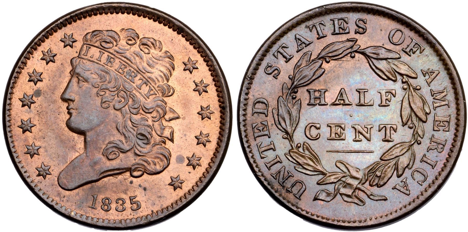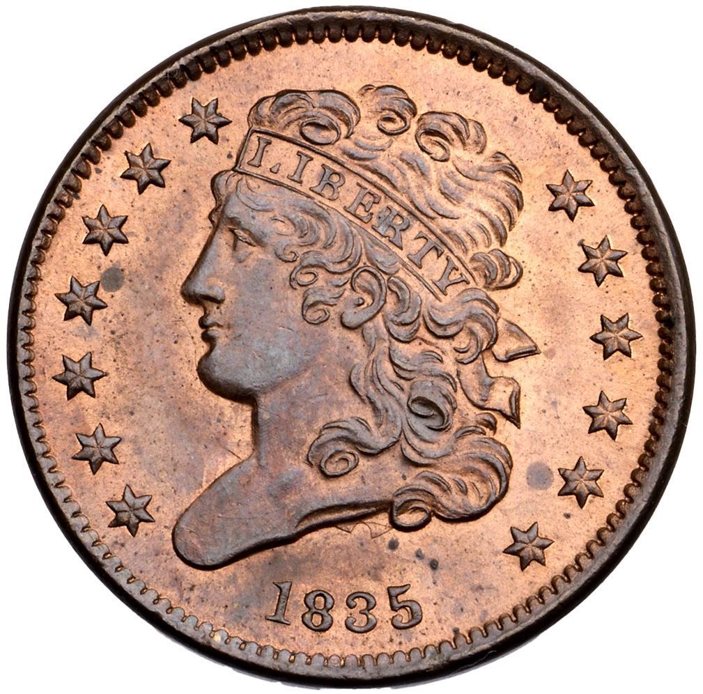 1835 C-1 R-1 MS63Choice lustrous bluish steel brown with half the mint state remaining on the obverse, 5% on the reverse. The notable marks are a trio of microscopic specks of carbon over the 5 in the date, a small spot of darker brown toning (not carbon) left of star 12, and a tiny planchet chip on the rim at D-S. MDS, Manley State 1.0Certificate Number: Pedigree: Ex; Richard Gross EAC 4/17/2004:61 - Bob Kebler Collection