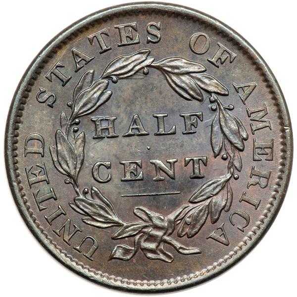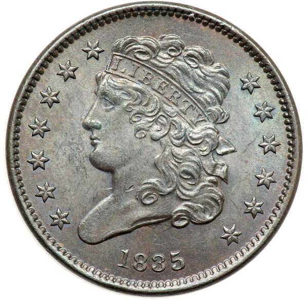 1835 C-1 R1 MS60. Lustrous olive and bluish steel with hints of faded mint color on the reverse. The surfaces are satiny and offer excellent eye appeal for the grade. A small nick on the neck left of the curl is a good identifying mark. MDS, Manley state 1.0. The die clashmarks are clear on both sides.