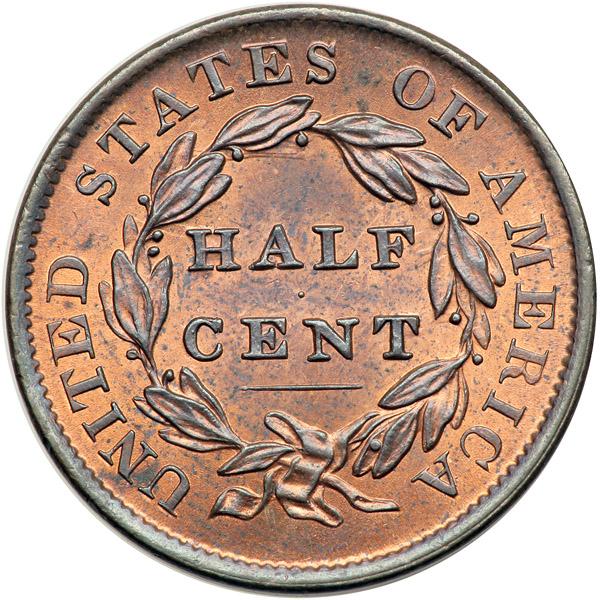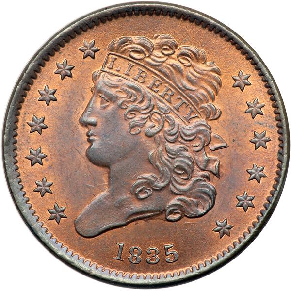 1835 C-1 R1 MS64. Lustrous mellowed mint red fading to bluish steel brown and olive on the devices, about two-thirds of the red remaining. The only marks are tiny specks of darker toning sprinkled over the reverse, strongest in the field between STATES and OF. The obverse is a flawless gem. LDS, Manley state 2.0, with clear die clashmarks on both sides and the reverse rotated 15 degrees CW. Removed from an ANACS slab graded MS64RD (ANACS label included, #820929, and it shows the attribution). Noyes photo #74327.
