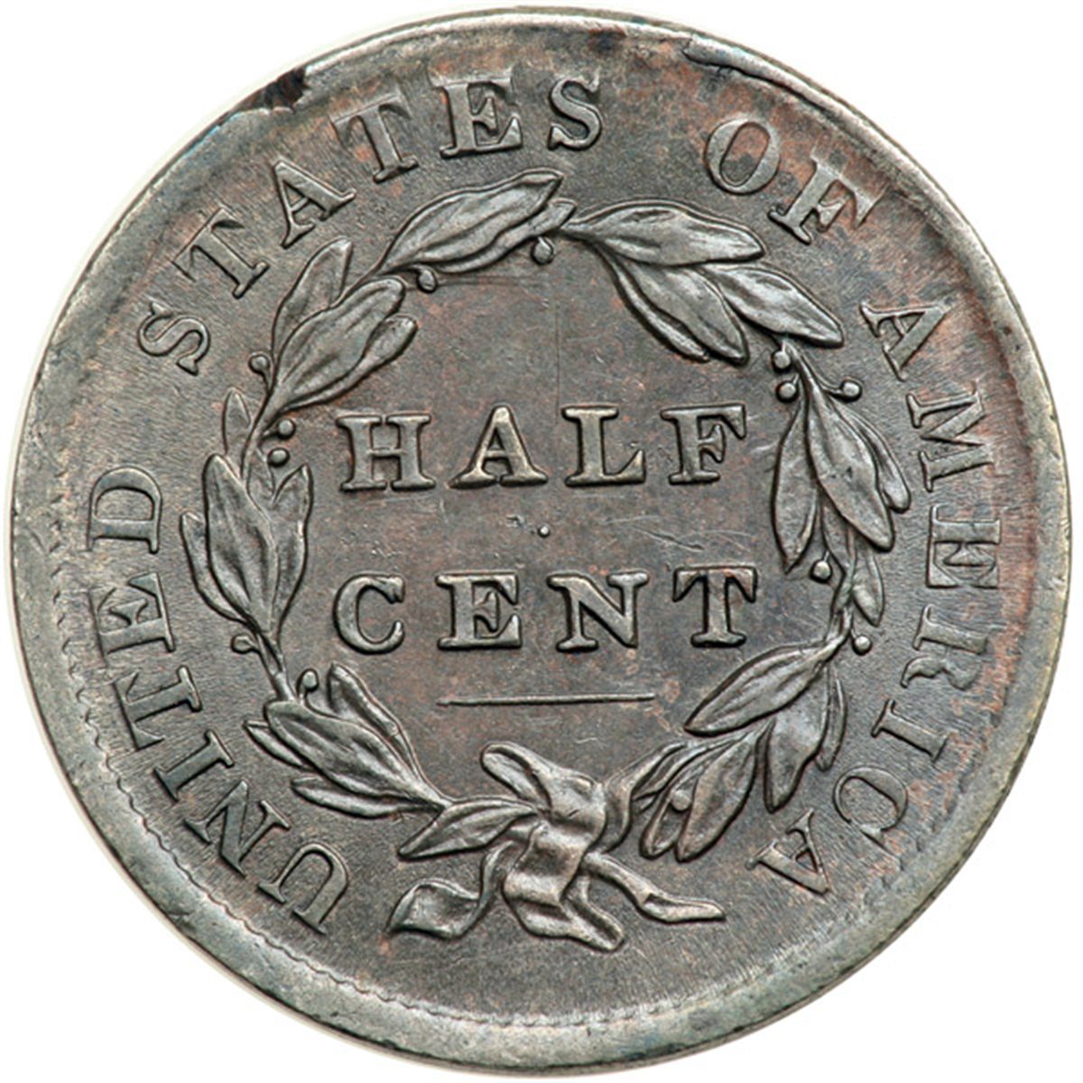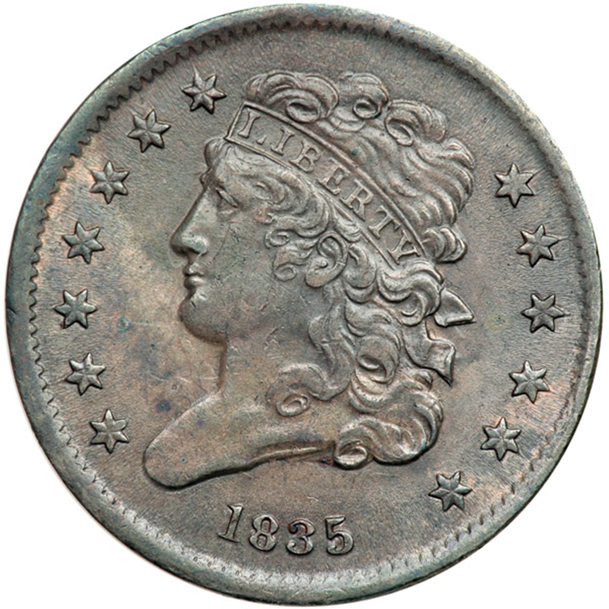 1835 C-1 R1 VF30. Struck on a planchet without upset rims (Stage I). Sharpness AU50 but there is a cut out of the rim over AT in STATES and a few very faint vertical hairline scratches down the portrait. Otherwise this piece is quite nice with satiny surfaces and no defects. Frosty grayish steel and light olive. LDS, Manley state 2.0. This piece was struck on a planchet that did not have the rims upset (Stage I). The result of this error is a piece with flat rims and poorly impressed dentils. A neat piece with a clearly different appearance.