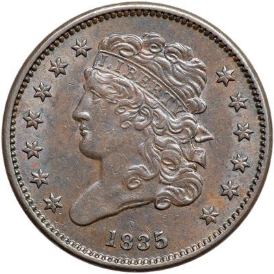 1835 C-2 R1. AU-50. Frosty chocolate and olive brown. No defects, only very light wear on the highpoints. LDS, Manley state 3.0, with a fine die crack arcing across the reverse.