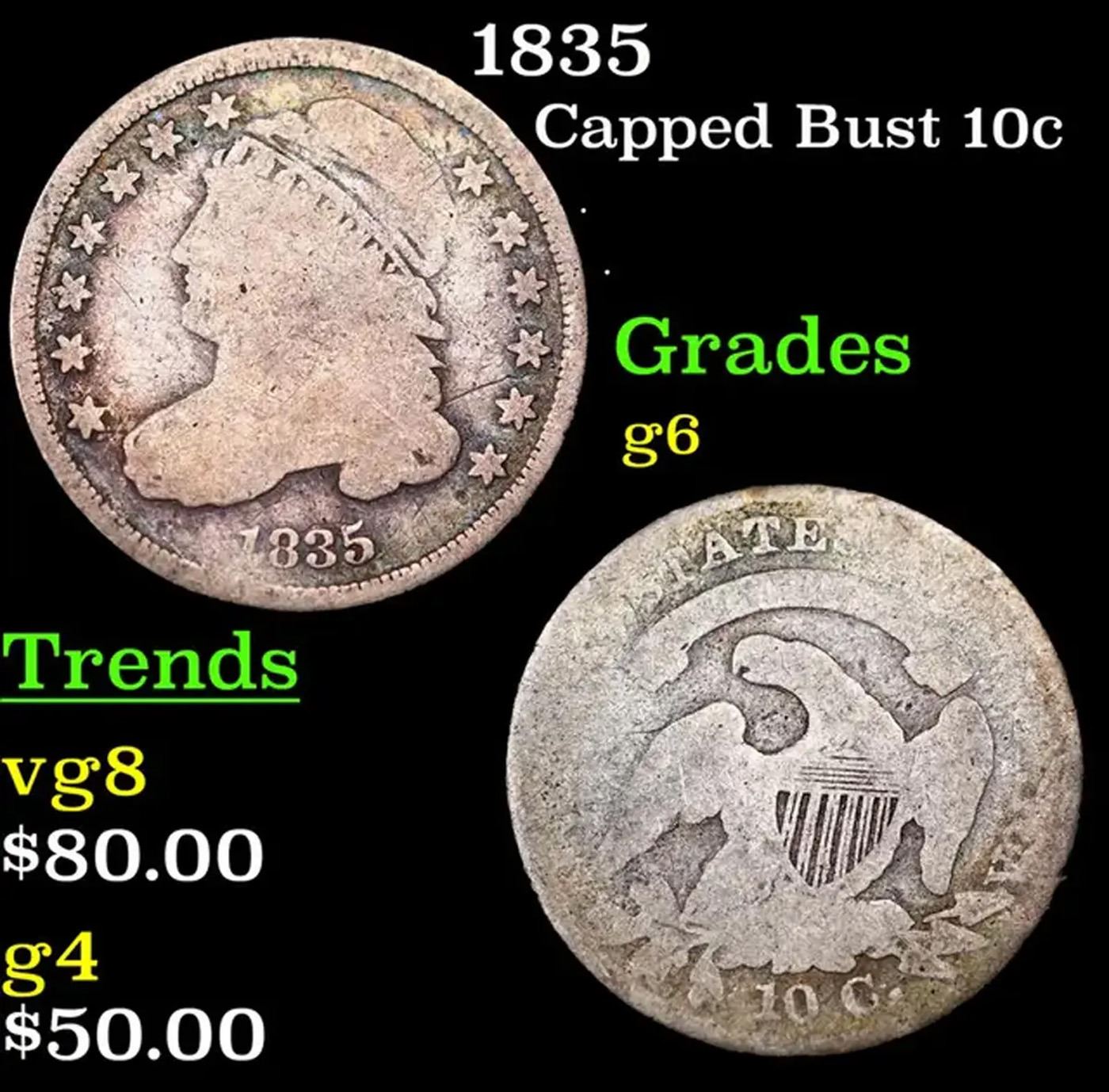 1835 Capped Bust Dime 10c Grades g+.