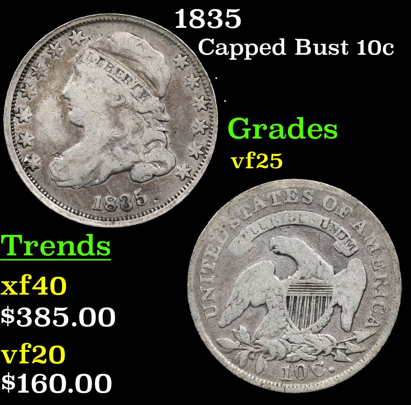 1835 Capped Bust Dime 10c Grades vf+.