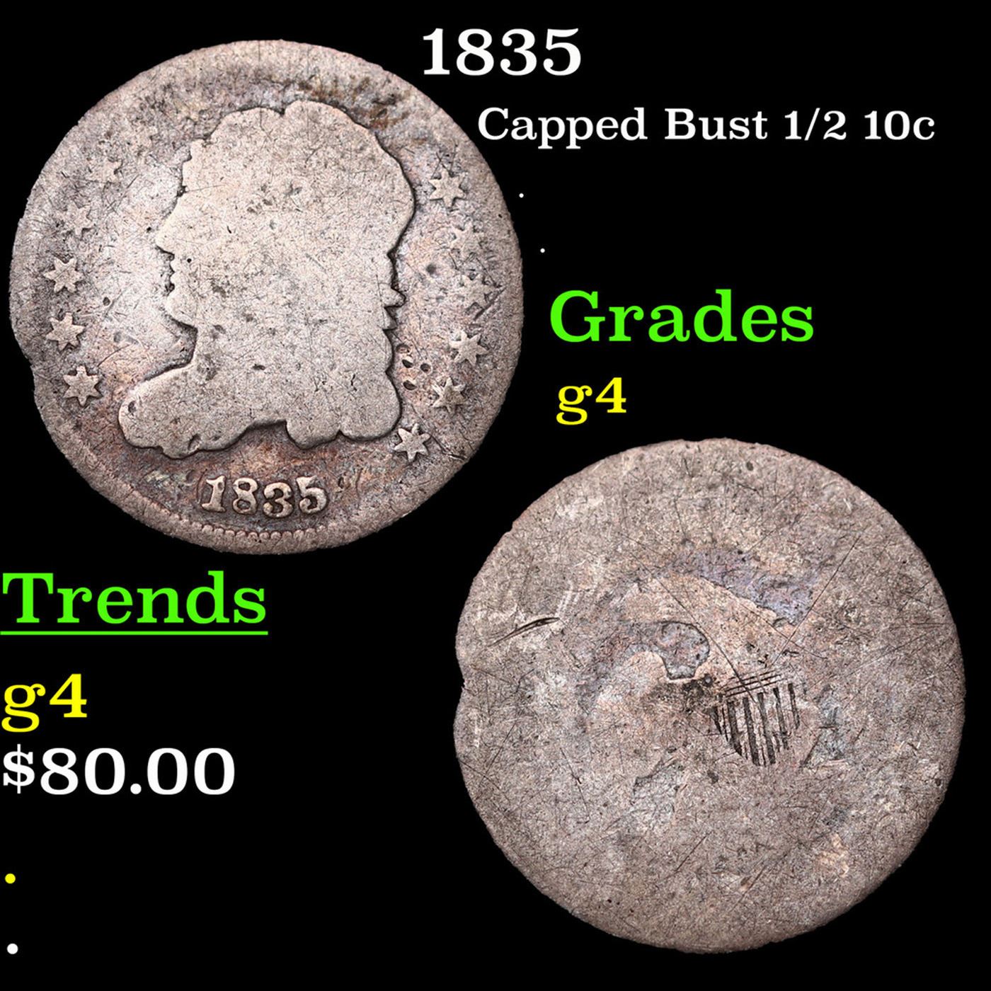 1835 Capped Bust Half Dime 1/2 10c Grades g, good.