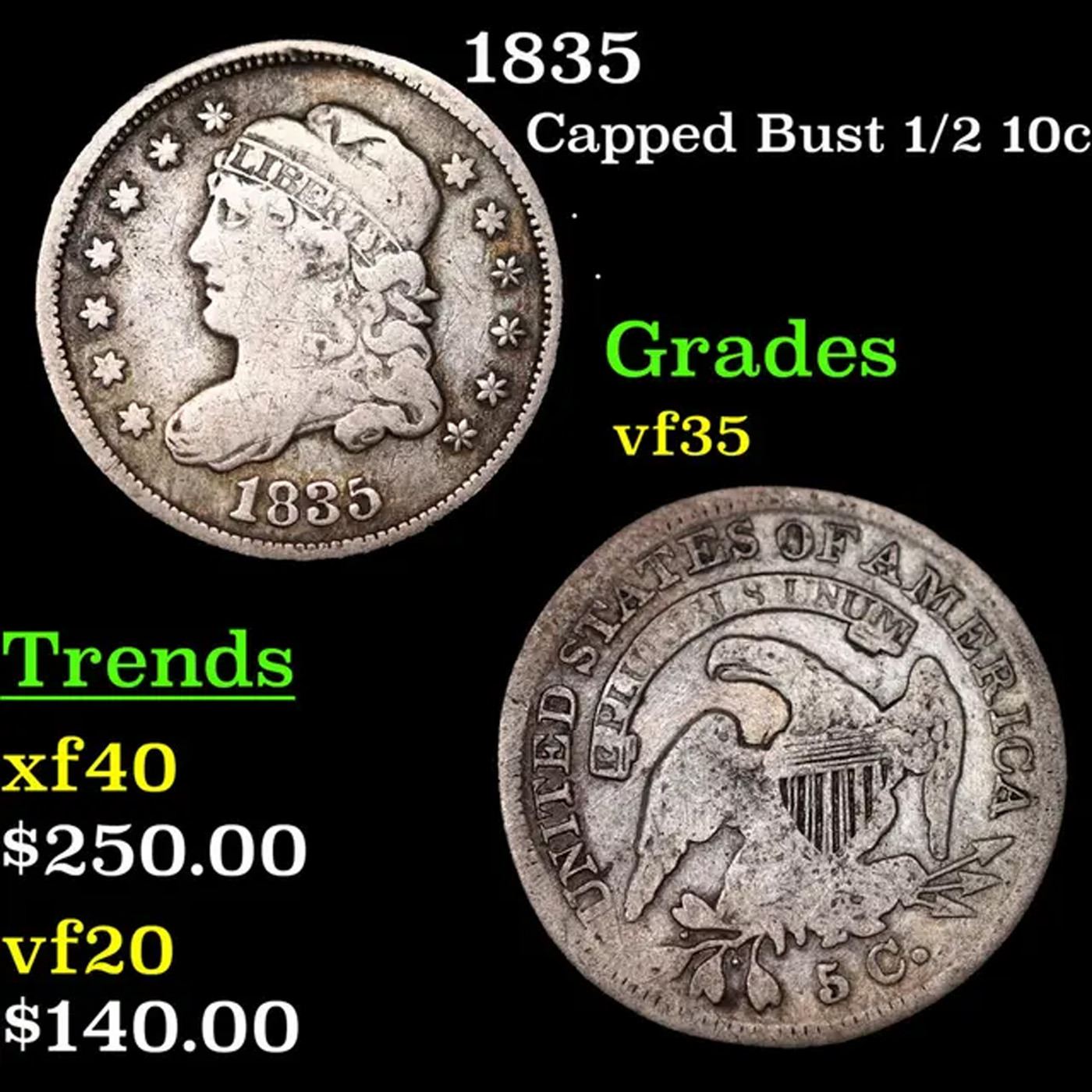 1835 Capped Bust Half Dime 1/2 10c Grades vf++.