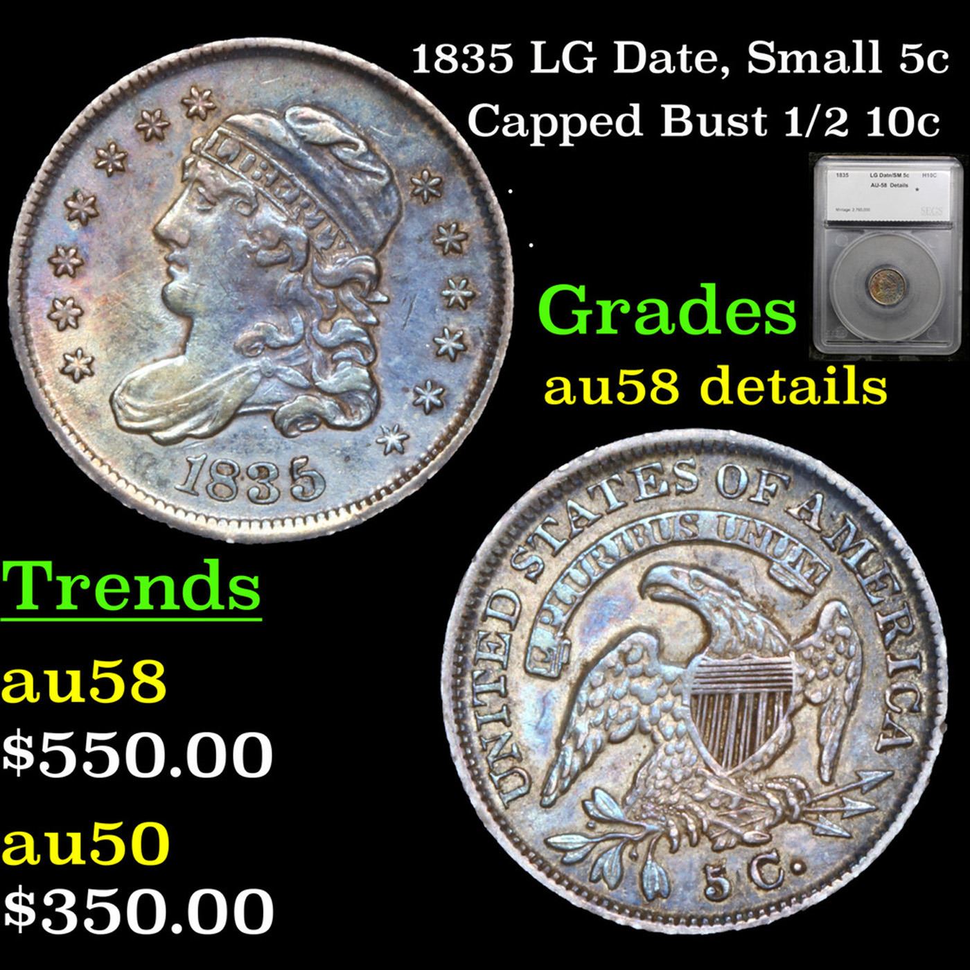 1835 Capped Bust Half Dime LG Date, Small 5c 1/2 10c Graded au58 details By SEGS