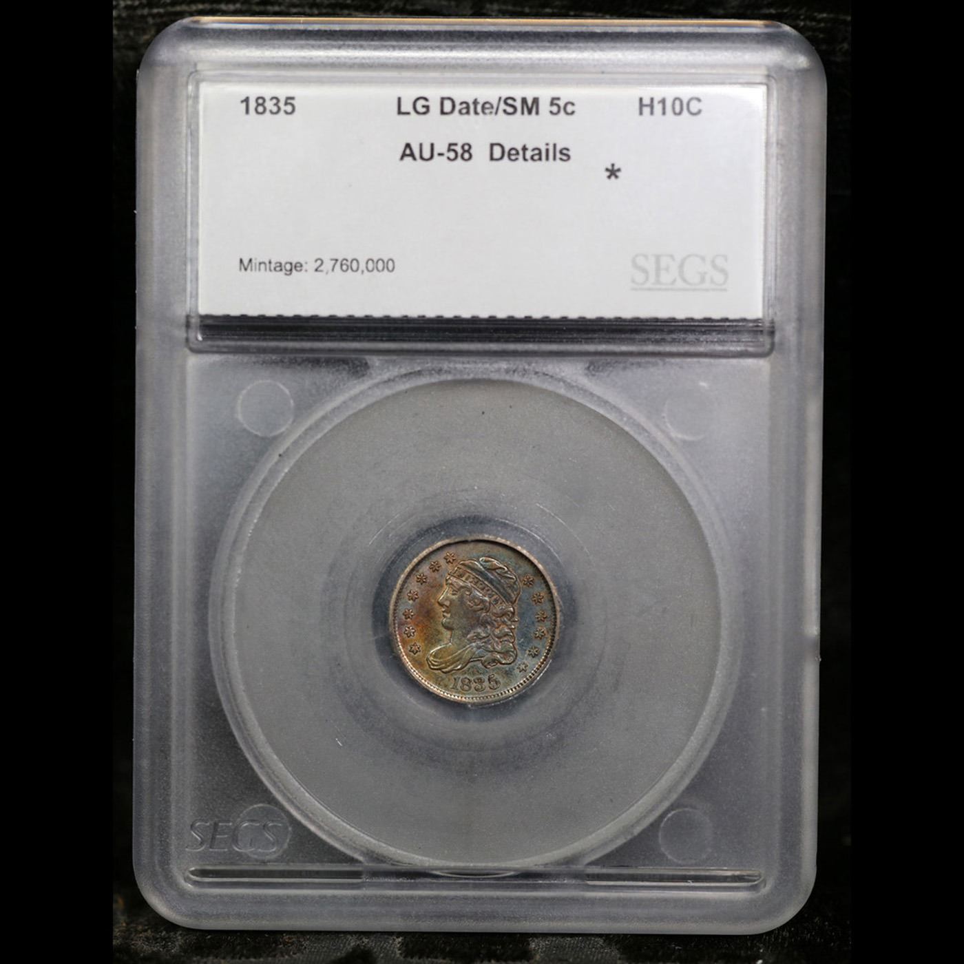 1835 LG Date, Small 5c Capped Bust Half Dime 1/2 10c Graded au58 details By SEGS.