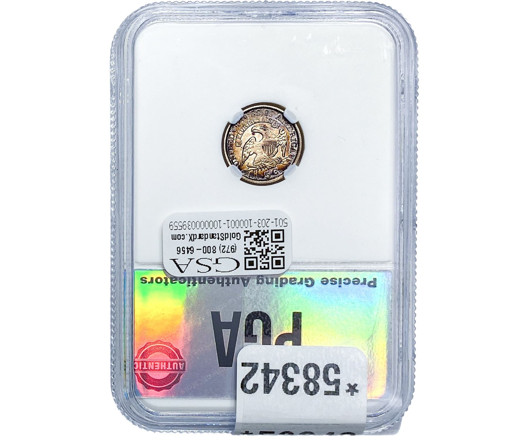 l. All non-certified coins and currency are guaranteed genuine, but are not guaranteed as to grade, since grading is a matter of opinion, an art and not a science, and therefore the description rendered by GSA or any third-party grading service may not agree with the opinion of others (including trained experts), and the same expert may not grade the same item with the same grade at two different times. GSA may, but is not obligated to, express an opinion as to non-certified numismatic items, in GSA’s opinion, or by its employees’ experience and the current interpretation of the American Numismatic Association’s standards as of the date the catalog was prepared. There is no guarantee or warranty expressed or implied that the grading opinions utilized by GSA, if any, will meet the standards of any grading service at any time in the future.
