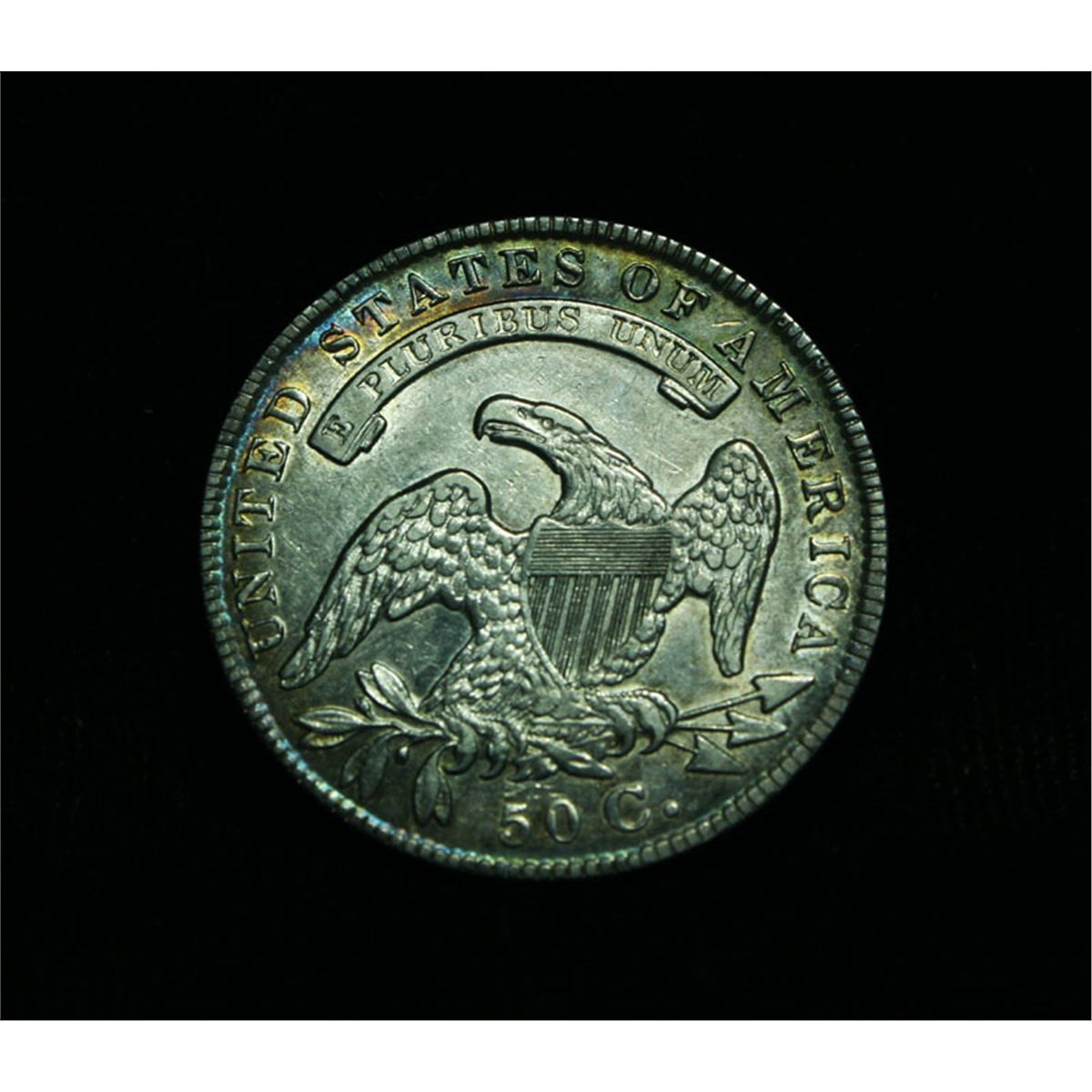 Very Attractive Rainbow Toned Capped Bust Half Dollar. Beautiful blue to yellow rainbow on the Obverse and Reverse. All original and natural toning. The Wholesale Greysheet lists ms60 at $825. Estimated Value $1000