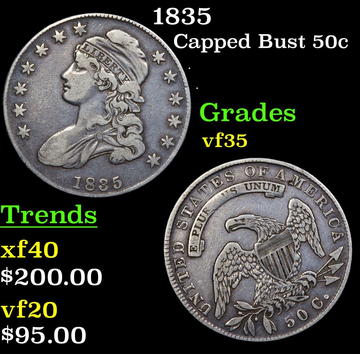 1835 Capped Bust Half Dollar 50c Grades vf++.