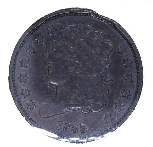 1835 Classic Head Half Cent. About Uncirculated. Small planchet clip at 1 oclock.