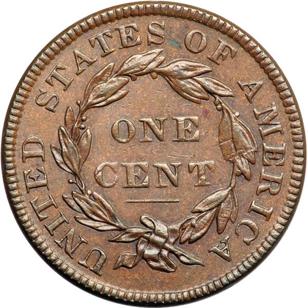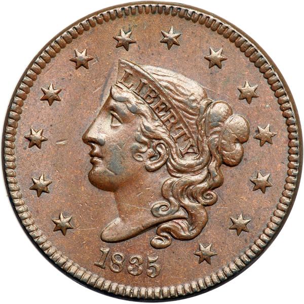 1835 Coronet Head Cent. PCGS graded AU-58. Frosty light steel brown. No notable defects, just a bit of very light wear on the highpoints. The best identifying mark is a tiny diagonal nick midway between star 3 and the tip of the nose. E-MDS with a fine but clear die crack from the dentils up through the right side of the 1 into the bust reaching the bottom of the neck where it disappears. The reverse is rotated 30 degrees CW. Removed from an NGC slab graded MS63BN (NGC label included, and it shows the attribution and Reiver provenance). Our grade is AU50. Pop 2; 1 in 64BN; 3 in 64 RB; 1 in 65RB. DWH #2937 (PCGS # 37060) .