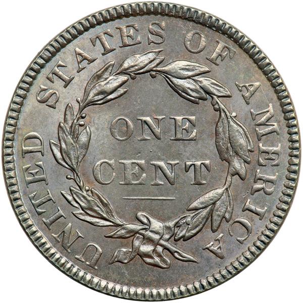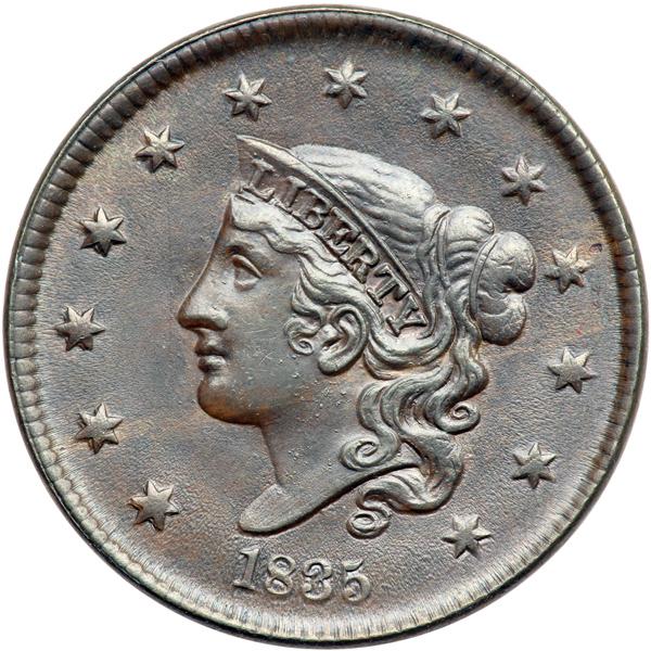 1835 Coronet Head Cent. PCGS graded MS-64 Brown. Choice lustrous bluish steel brown with a faint streak of slightly lighter brown toning from star 2 to above star 11. No defects and outstanding eye appeal. The obverse is satiny and the fine flowline luster covers even the highest points of the design. The reverse fields are hard and slightly reflective thanks to the new die. The contrast between the worn out obverse die and new, prooflike reverse die is remarkable. EDS, the only state for this brief die marriage, although this piece is especially early as evidenced by the prooflike reverse. CC#1, the only mint state example known of this rare variety. Called MS60 and CC#1 by 15 points in the Noyes census, his photo #22315. Bland says MS60 and CC#1 by 10 points. This is a fantastic cent, a highlight of an outstanding collection. Plated in the Wright book to illustrate the variety. Our grade is MS62. Pop 1. The only example graded at PCGS for the variety. DWH #3155 (PCGS # 37072) .