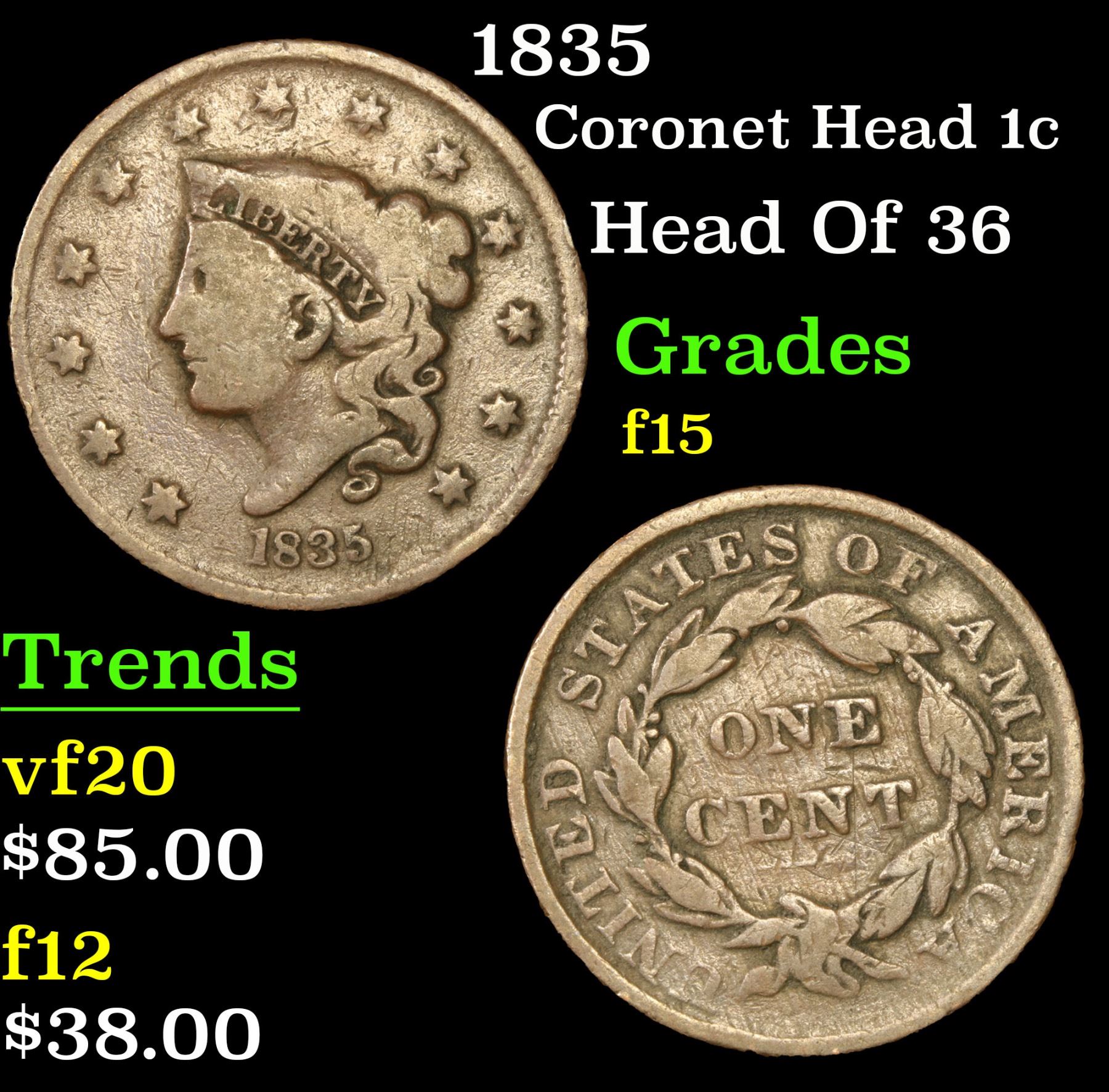 1835 Head Of 36 . Coronet Head Large Cent 1c Grades f+.