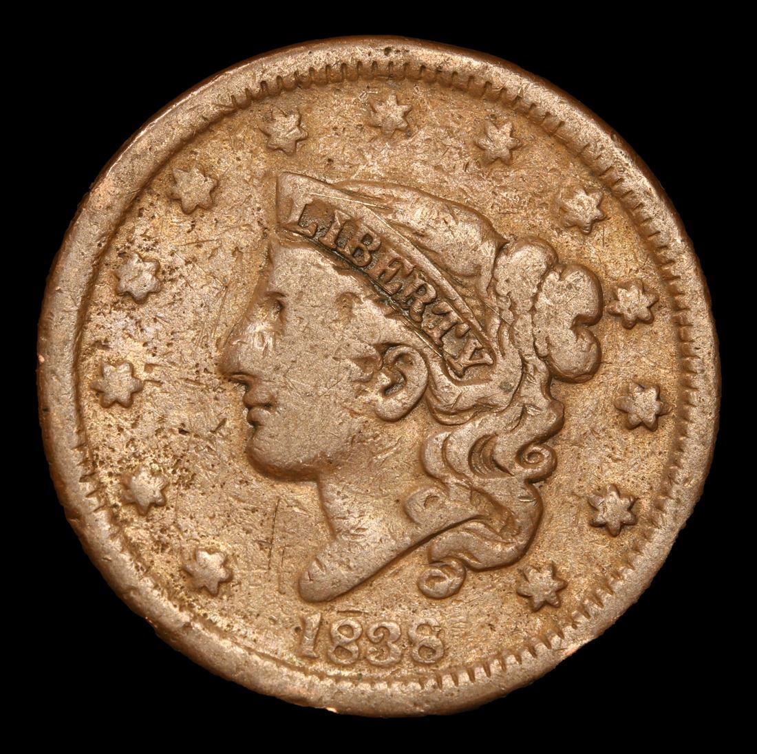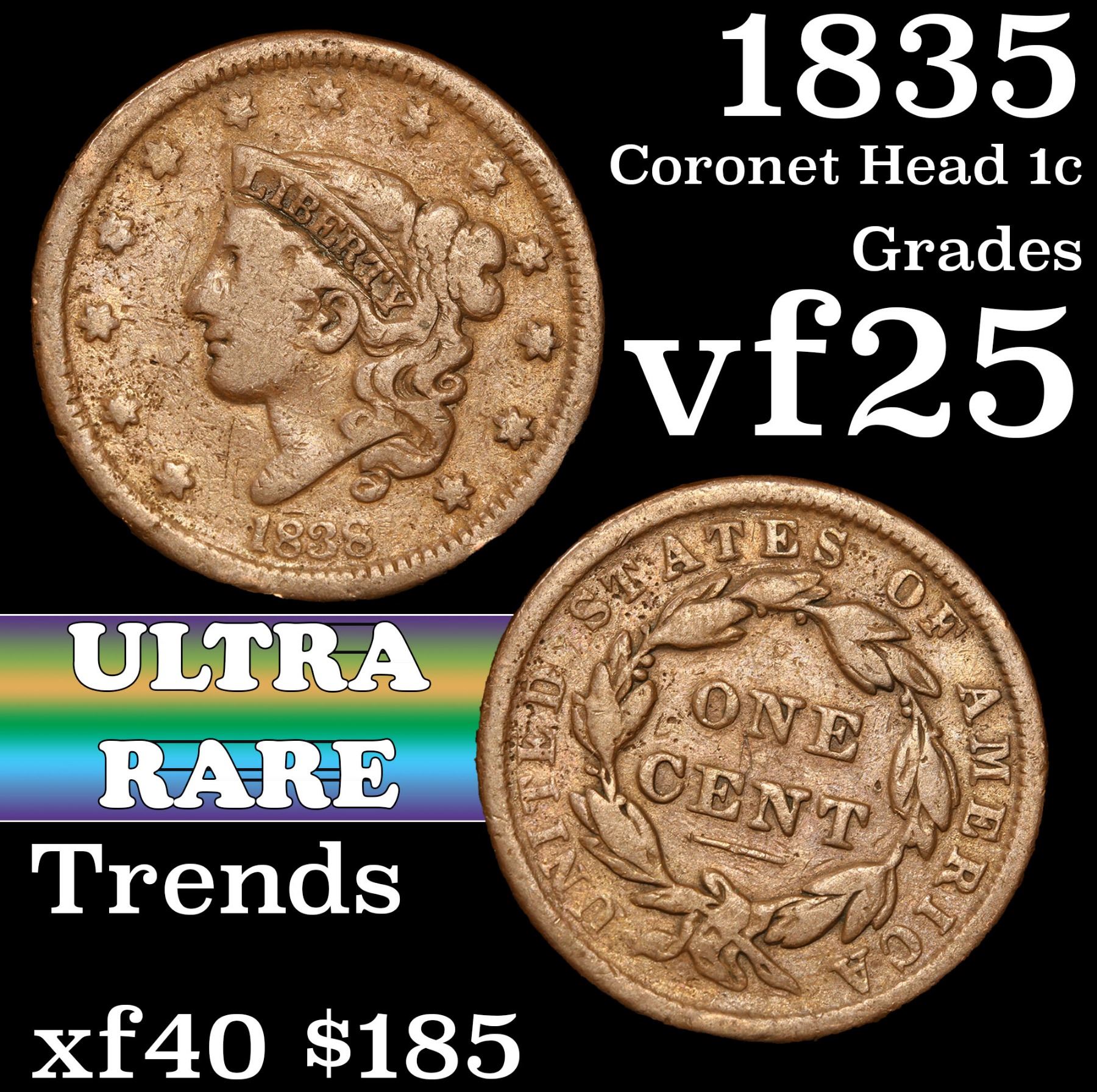 1835 Coronet Head Large Cent 1c Grades vf+.