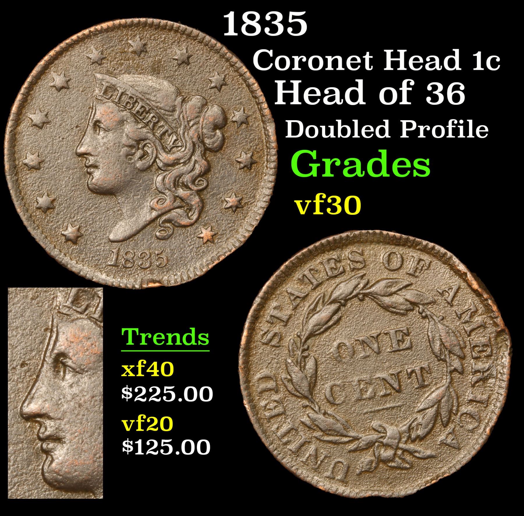 1835 Coronet Head Large Cent 1c Grades vf++. Head of 36; Doubled Profile A Corey's Pick, Bid to Win Coin