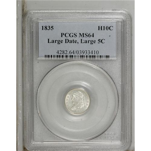 <B>1835 H10C Large Date, Large 5C MS64 PCGS.</B></I> V-3, LM-3, R.1. Block 8 in date, a faint crack from rim through base of digits 183, a crack along inside points of stars 8 through 12, and a crack from top of cap to rim. On the reverse, the tip of the feather is centered over the flag of 5. A lustrous untoned near-Gem, and relatively sharp motifs. A few light marks are noted on the cheek, and doubling occurs on the date and some stars. Population: 92 in 64, 55 finer (2/07).<BR><BR><b>Shipping:</b> Coins & Currency (<a target="_blank" href="http://www.heritageauctions.com/common/shipping.php">view shipping information</a>)