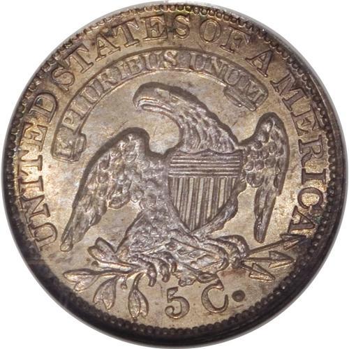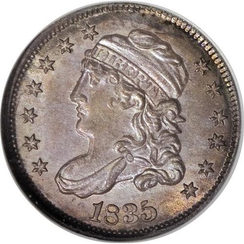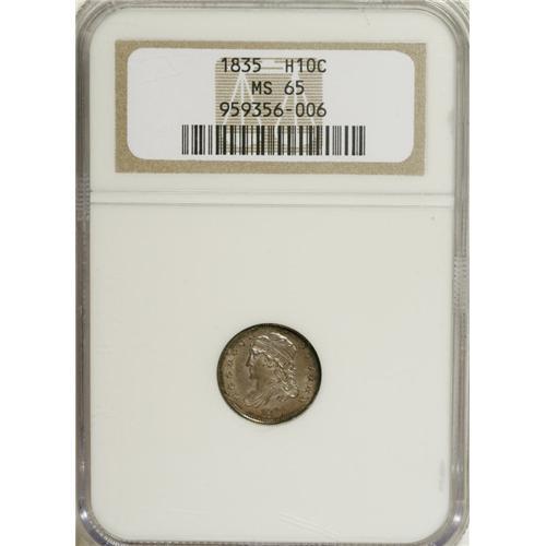 <B>1835 H10C Large Date, Large 5C MS65 NGC.</B></I> V-11, LM-4, R.3. The large date, fancy 8, the last A of AMERICA touching the arrow feather, and the large 5 C confirm the variety. This Gem displays lustrous surfaces toned in orange, violet, and lilac on the obverse, and delicate golden-tan and sky-blue on the reverse. A sharp, even strike brings out excellent definition in the design elements. Both faces are devoid of significant marks. Census: 70 in 65, 61 finer (4/07).<BR><BR><b>Shipping:</b> Coins & Currency (<a target="_blank" href="http://www.heritageauctions.com/common/shipping.php">view shipping information</a>)
