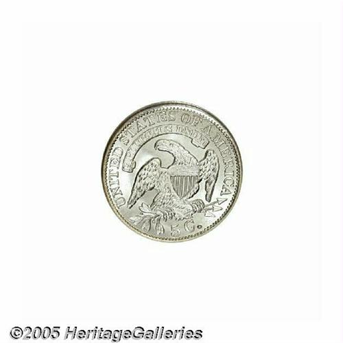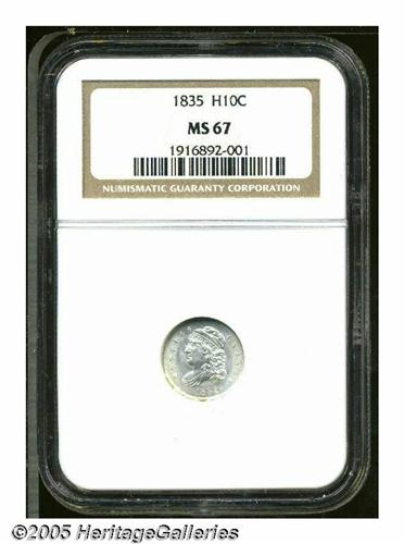 <B>1835<H10C> Large Date, Large 5C MS67 NGC.</B></I> LM-7, V-4, R.3. Fully brilliant with an intense frosty sheen and a good strike despite a somewhat advanced die state. Die clashing is on clear display in front of the portrait and a spindly die crack connects several of the stars along the right obverse periphery. Condition Census quality for this otherwise more obtainable die pairing. Population: 13 in 67, 3 finer (6/05).