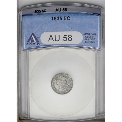 1835 H10C Large Date, Small 5C AU58 ANACS. V-9, LM-6, 1835[H10C] Large Date, Small 5C AU58 ANACS.
