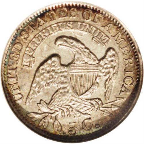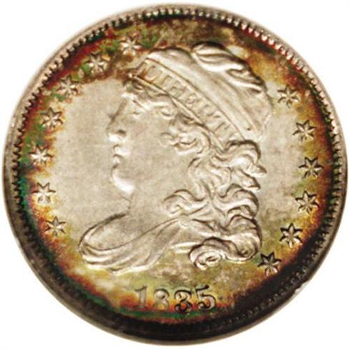 <B>1835<H10C> Small Date, Large 5C MS65 NGC.</B></I> V-5, LM-8.2, R.2. Apple-green, cherry-red, and gold shades adorn the borders, a bit more intensely on the obverse. This intricately struck, splendidly preserved, and satiny Gem features cream-gray centers. LM-8.2 reunites the die pair from LM-8.1, after the reverse die was used to coin LM-9.1 while mated with a different obverse die. The hair-thin die crack from the T in UNITED to the scroll distinguishes LM-8.2 from LM-8.1.
