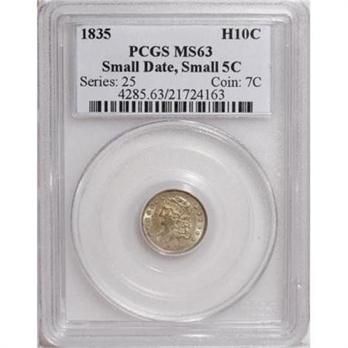 <B>1835 H10C Small Date, Small 5C MS63 PCGS.</B></I> V-7, LM-10, R.1. An exactingly struck almond-gold representative with impressively unabraded fields and devices. Undoubtedly scarce in such quality, yet affordable for an early silver type.<BR><BR><B>Coin Engraver:</B> William Kneass<BR><BR><b>Shipping:</b> Coins & Currency (<a target="_blank" href="http://www.heritageauctions.com/common/shipping.php">view shipping information</a>)