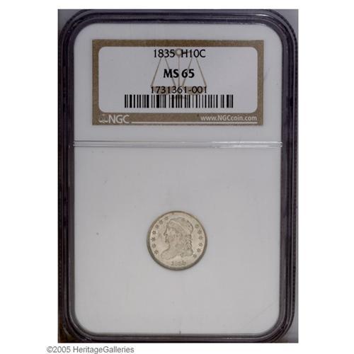 <B>1835<H10C> Small Date, Small 5C MS65 NGC.</B></I> LM-10, V-7, R-1. Silver-gray surfaces display traces of light tan, and the design elements are sharply struck, with all areas revealing excellent definition. The surfaces are well preserved, with just a few scuffs noted in the right obverse field. Population: 68 in 65, 53 finer (10/05).