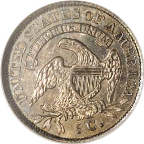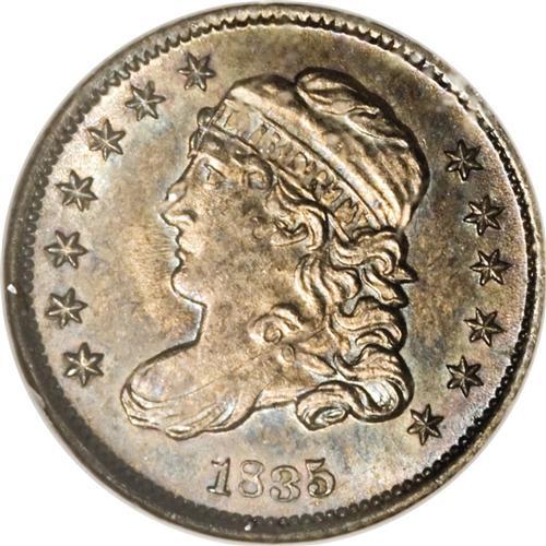 <B>1835 H10C Small Date, Small 5C MS65 NGC.</B></I> V-7, LM-10, R.1. Aqua-blue, rose, and yellow-gold toning drapes this unabraded and satiny type coin. The strike is meticulous save for slight incompleteness on the left shield border and Liberty's earlobe. The date and denomination logotypes of this date show unusual size variation.<BR><BR><b>Shipping:</b> Coin/Currency (<a target="_blank" href="http://www.heritageauctions.com/common/shipping.php">view shipping information</a>)